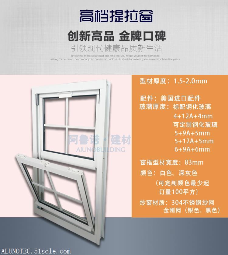 提拉窗垂直向上和向下打开,因此窗口的力集中在窗扇上,墙和窗框上的负载比平开窗小得多,因此轮廓的惯性矩较小,以及美国提拉窗的框架包层风扇结构不仅得到了更好的气密性,水密性和不错的节能效用,而且还可以在上下移动窗扇时安装在窗框中。窗扇只能向内落下,而不须顾虑向外滑动。它用以高层建筑。安全性能大大提高。